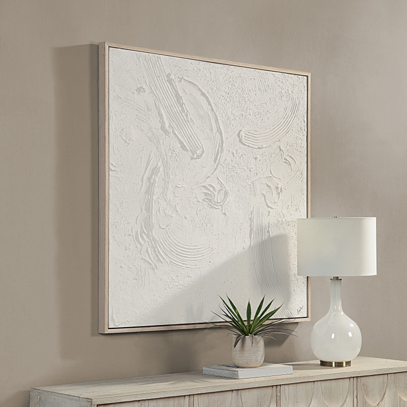 Upgrade your home decor with the stunning Luz 50" wide canvas art with wood frame. Expertly crafted with high-quality materials, this art piece boasts a sturdy wood frame that provides a sleek finish, while the wide canvas makes a bold statement in any room. The neutral cream hue allows for versatility in your decor, making it the perfect addition to any modern or traditional space. Its 100% hand-painted design ensures genuine craftsmanship and one-of-a-kind artistry that will add an unmatched touch of elegance to any room. The piece is designed for both vertical and horizontal hanging options, providing versatility while beautifying your walls. Elevate your space with this canvas, which comes fully pre-framed for immediate display and enjoyment. Product Details: