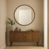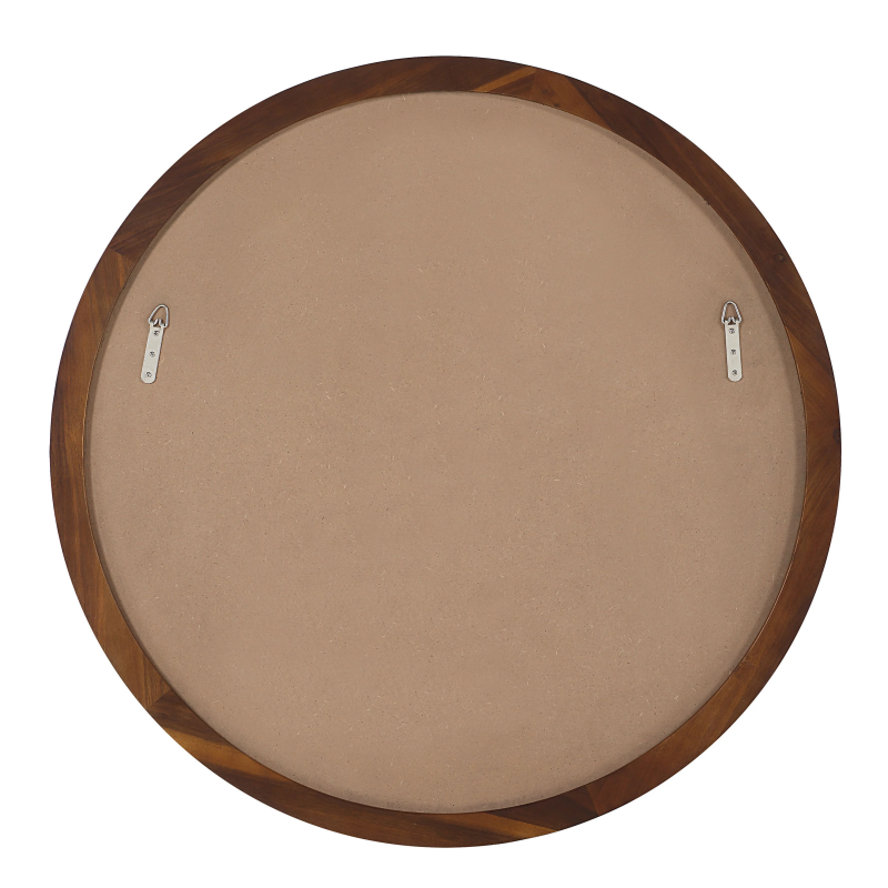 Discover this clean-lined round mirror to give your design project style without sacrificing function. Crafted with high-quality distortion-free glass and a walnut-finished frame, this round mirror would be perfect hanging on its own or mixed into a gallery wall for an eye-catching impact. Product Details:
