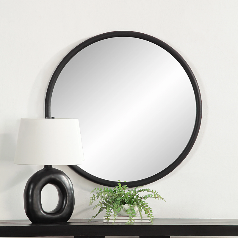 The Namur 36" Tall Round Mirror in Matte Black is the perfect addition to any modern home. With clean lines and a sleek design, it's sure to add a touch of sophistication to any space. The mirror is optimized for easy vertical hanging and features a D-Ring system for effortless installation. Its round shape adds visual appeal, while the matte black finish provides a contemporary touch. This mirror is not only stylish but functional as well, making it the perfect choice for any room in your home. Upgrade your decor and get your hands on the Namur 36" Tall Round Mirror today. Product Details: