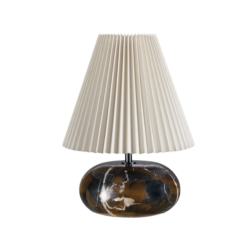 With its unassuming yet stylish black marble body and soft ivory‑toned pleated drum shade, the Philbert table lamp offers a high‑impact look in a compact footprint. Designed for the Arren Williams collection, it measures about 10″ wide × 14″ high, perfect for side tables or bedside use in today’s neutral interiors. Product Details: