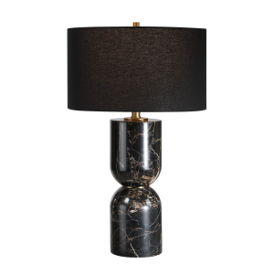 The Enri table lamp blends modern glam with sculptural elegance. Its sleek black marble base and antique brass accents team up with a black linen drum shade for a dramatic yet refined look. With a rotary dimmer for customizable light, it’s the perfect statement piece for contemporary or transitional interiors. Product Details: