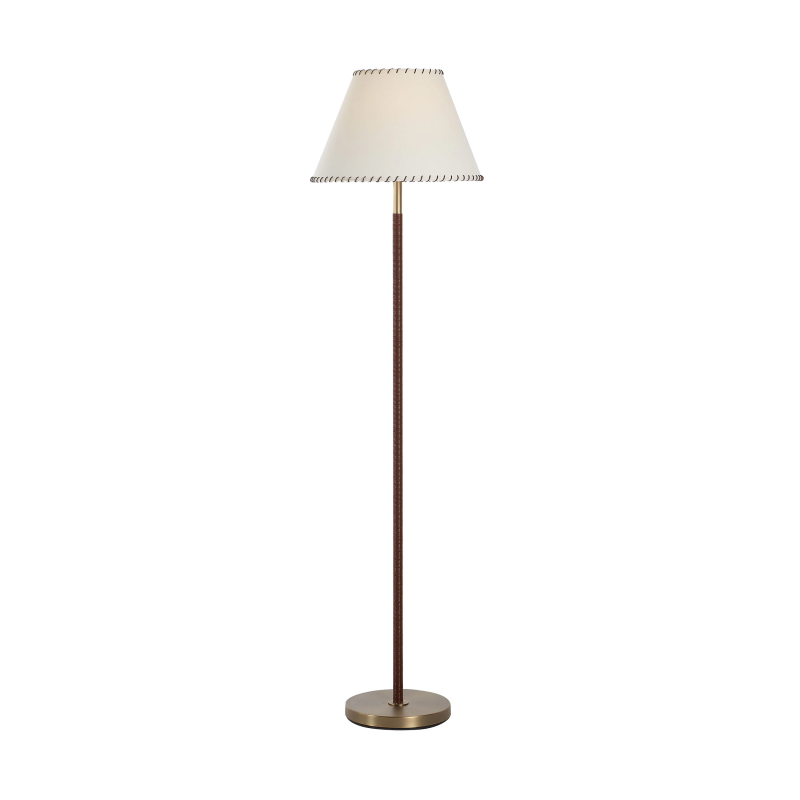 From timeless finishes to unique details, this transitional floor lamp checks off all the boxes on your must-have list. Its stylish body features a dark antique brushed brass finish for a time-loved look while its ivory linen shade features vegan leather stitching for an eye-catching artisanal effect. Product Details: