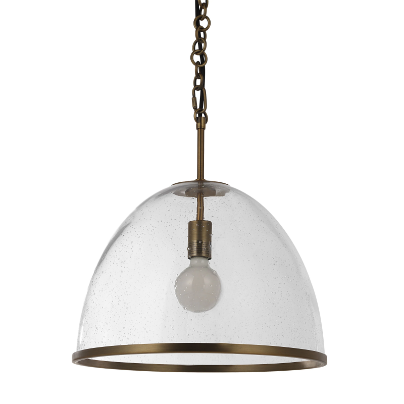 Offering softly diffused, yet ample lighting in any space, this seeded glass light fixture will bring a fresh update to any room. Traditional meets modern in its dome-shaped shade featuring dark antique brass-plated accents. Perfect for hanging solo or in multiples, it's up to you to decide how big an impact you'll make. Product Details: