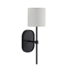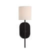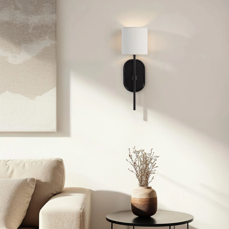 Combining sleek matte black-painted forged aluminum and pure ivory linen, incorporate this handsome wall sconce in your decorating scheme to deliver transitional charm and warm, ambient light at the flick of a switch. Displayed on its own, it makes a statement of great taste that gets exponentially stronger when paired up or featured in multiples. Product Details: