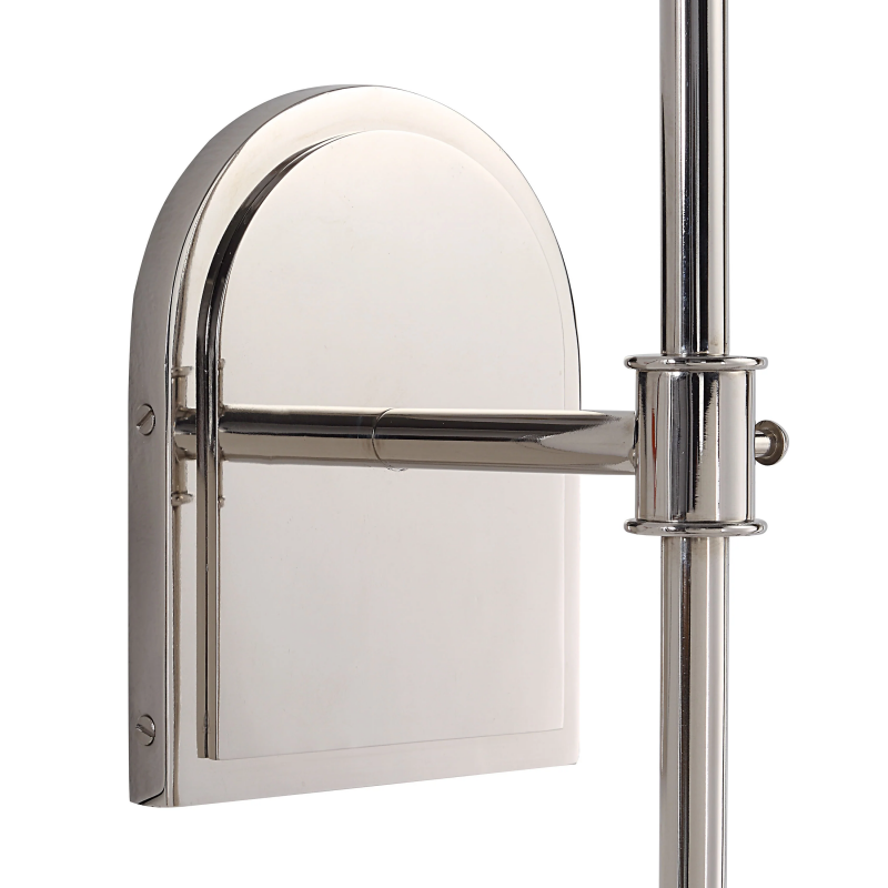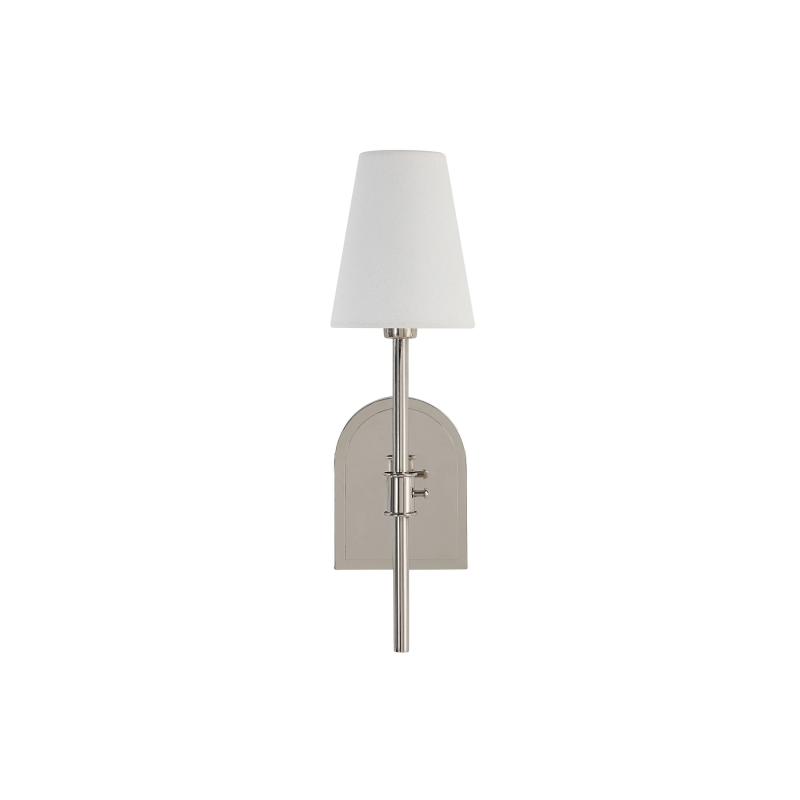 Layering the lighting in your interior design project is a perfect way to add style and function to any space. Crafted with a polished nickel-plated finish and a tapered off-white linen shade, this wall sconce gets a modern update with an arched backplate to deliver an aesthetic that is both timeless and on-trend. Product Details: