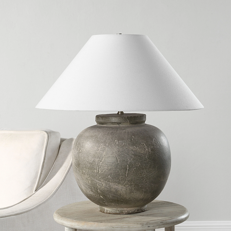 To say that the earthenware look is having a real moment in the decorating world is a bit of an understatement. The Olivia table lamp is a prime example of our love for this timeless material. Crafted from hand thrown ceramic with plenty of texture and a stunning olive wash finish, it brings an organic look and feel to any interior. In contrast to this earthy vibe is a large off-white linen tapered shade that sits atop a champagne plated fitting and included bulb that work together to fill the room with a dimmable filtered ambient glow. Whether you place a pair on a sideboard in a dining room or use one as a bedroom table lamp, the end result will be stunningly stylish. Product Details:
