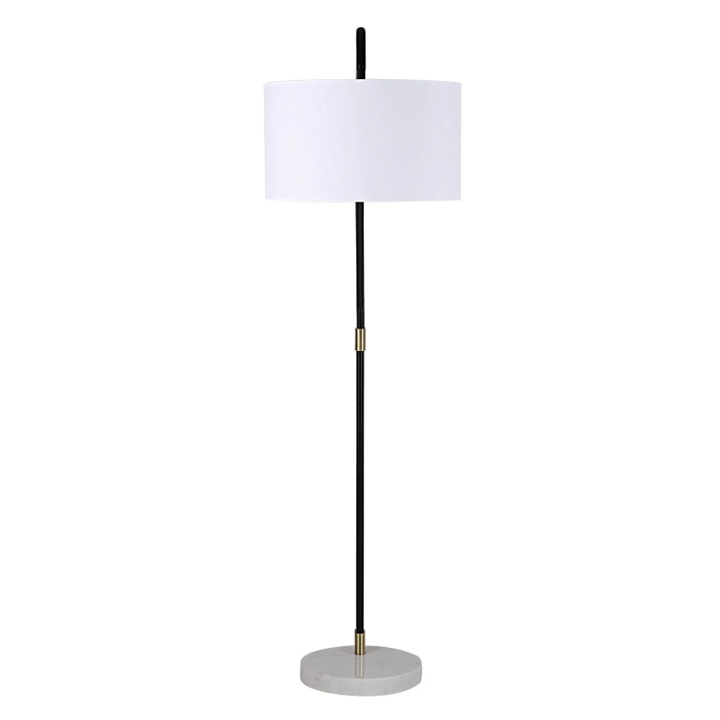 The bedroom or living room interior is elevated to new heights when this floor lamp enters the space. This piece serves as a luxe, streamlined work of art in the home. When lit, it envelops the room in a warm, glow while offering utility. The composition of this lamp, powder-coated iron, marble base and cotton shade, makes it optimally suited for industrial and contemporary interiors. Product Details:
