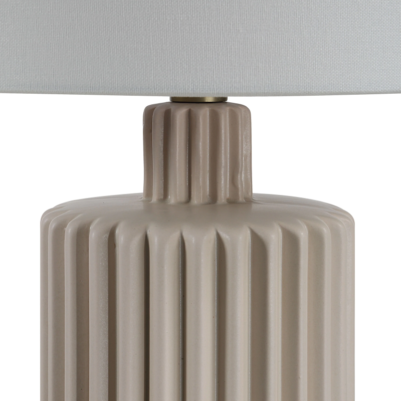Update any interior with the texture and neutral hues of this ribbed ceramic table lamp. Measuring two feet tall, it holds a stately presence in a bedroom, living room or dining room. Offering dimmable lighting and a diffused glow thanks to its linen drum shade, this beige lamp will add style and light to your design project. Product Details: