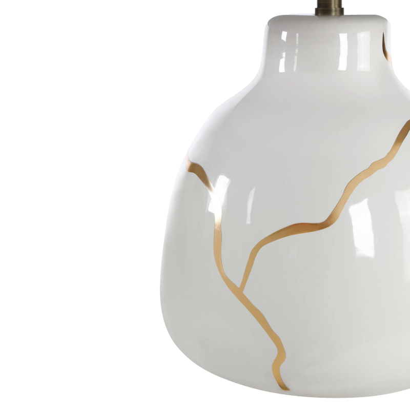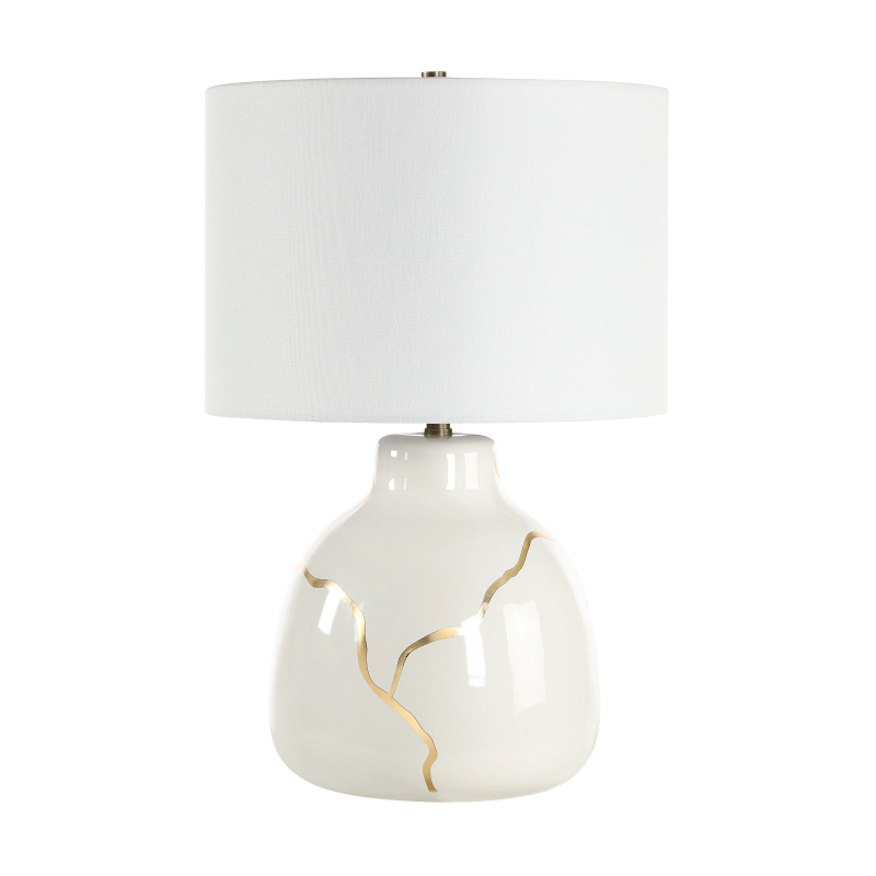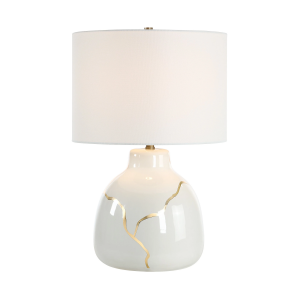 The Rhodes table lamp brings artful elegance to any space with its ivory ceramic base, embellished with graceful gold leafing inspired by Kintsugi craftsmanship. A clean off-white drum shade and dark antique brushed brass accents balance the design with modern flair. Warm and sophisticated, its gentle glow shines through its imperfect beauty. Product Details: