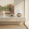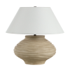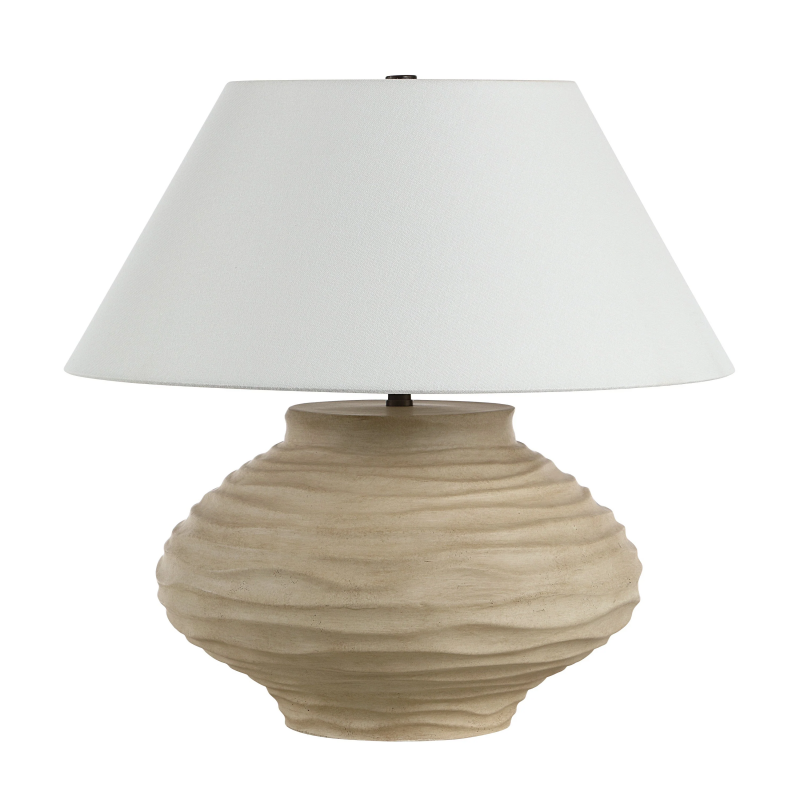 The Ola table lamp exudes natural charm with its hand-crafted appearance and carved beige base. Paired with an ivory linen shade and dark antique bronze accents, it offers both sculptural beauty and soft illumination. Perfect as a statement piece on an end table or in pairs on a buffet, it brings warmth and organic elegance to any contemporary space. Product Details: