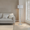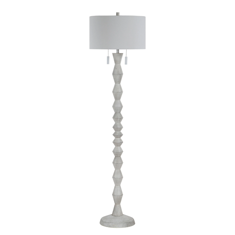 Elevate any interior with the classic style of this floor lamp. Designed with a lathed-look and hand-painted white wood texture, it's perfect for any modern or transitional living room, dining room or office. Simply give one of its pull chains a tug to enjoy the ambient glow given off through its off-white linen drum shade to set the perfect vibe. Product Details: