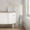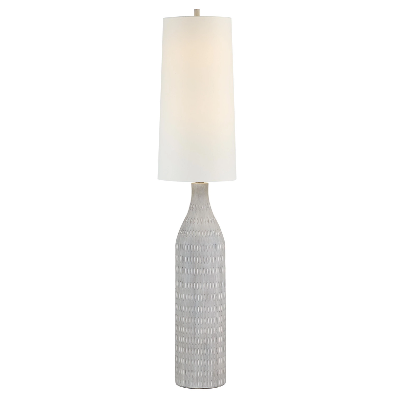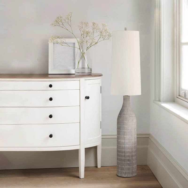 Texture and light blend beautifully in the Crimsom floor lamp from the Renwil Studio Collection. Perfect for adding a finishing touch to any space, it features a long and lean textured body with a soothing cream finish, that's topped off with a clean-lined oatmeal linen drum shade. Whether used as a bedroom lamp, living room lamp or dining room lamp, its dimmer foot switch allows for lighting customization to suit the mood, delivering instant ambiance. Product Details: