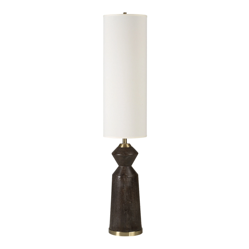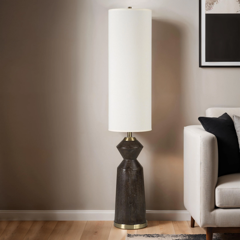 Featuring a dramatically elongated, cream linen lampshade, the Pixel floor lamp is ready to cast a warm and cozy glow in any interior. In contrast to all that illumination is a stunning dark brown, white-washed body with bronze-plated accents and a modern geometric shape that ground the lamp in the space. Place one in the corner to create a cozy reading spot or try one sofa-side for instant adjustable ambiance. Product Details: