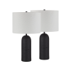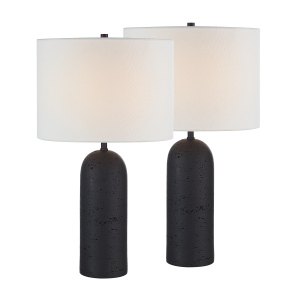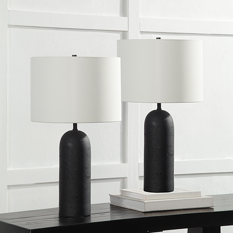 Upgrade your home decor with the sleek and stylish Augusta 25" tall black resin table lamp. Its stunning black finish, paired with the off-white linen drum shade, creates a contemporary look that will elevate any space. This lamp conveniently connects with standard E26 sockets and supports bulbs up to 100W, ensuring compatibility with a wide range of lighting options. The equipped dimmer socket allows customizable lighting to set the mood for any occasion. This set of 2 lamps will provide a complete ensemble in any room, making the table lamp a must-have addition to your home. Product Details: