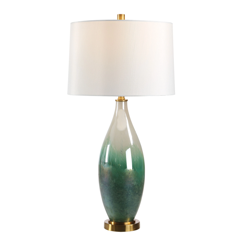 Featuring a rich green glaze and brushed bronze details, this table lamp is an easy way to add an earthy yet sophisticated touch to any interior. Crafted from ceramic with an off-white faux silk drum shade for a soft glow, it brings a classic look to a living room, bedroom, dining room or hallway.