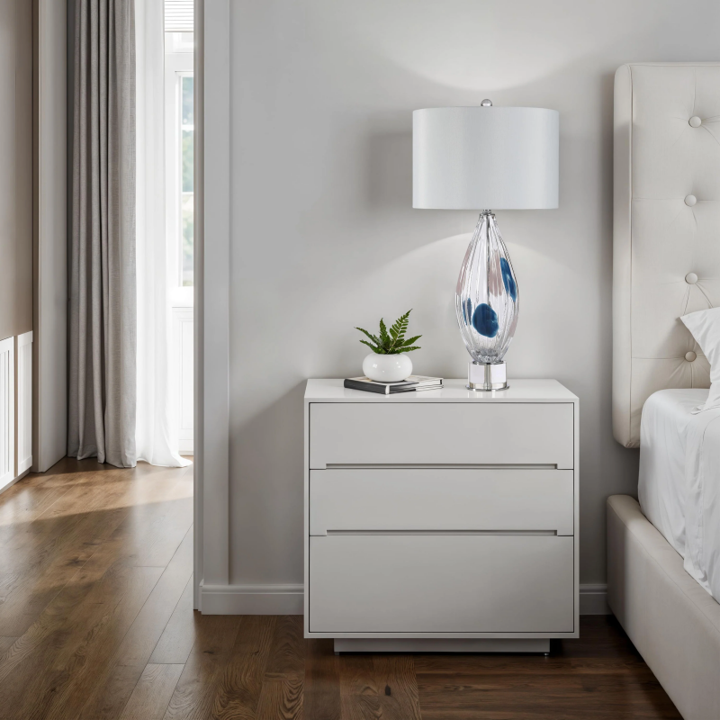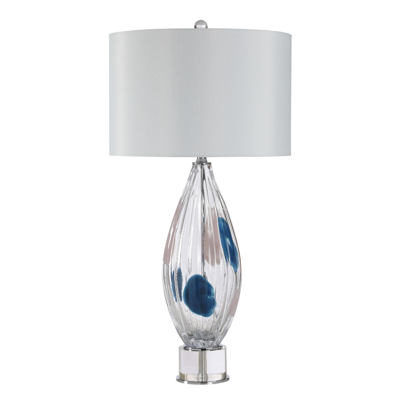 Add a dash of whimsy to a bedroom, living room or reading nook with this clear and blue glass table lamp. Adorned with chrome accents for a little sparkle, and a faux silk drum shade for added class, this lamp will shed soft light anywhere it's needed while bringing transitional style to any space. Product Details: