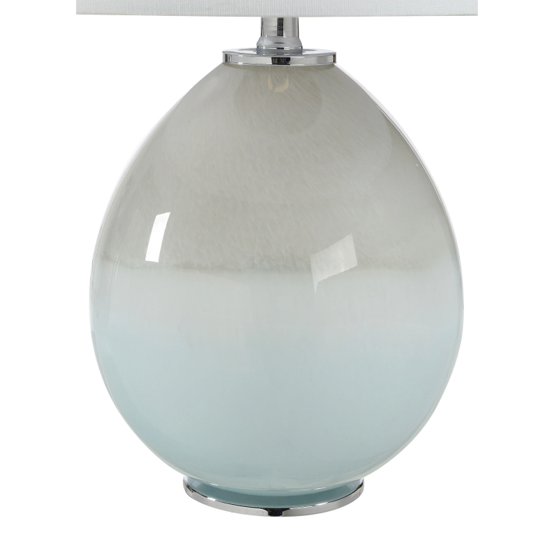 Your search for the perfect table lamp to feature in your transitional design project ends here. This one expertly combines pale blue glass, chrome details and a crisp white linen shade to create a lamp with classic good looks. Anywhere you place it, beautiful light and style are guaranteed. Product Details: