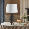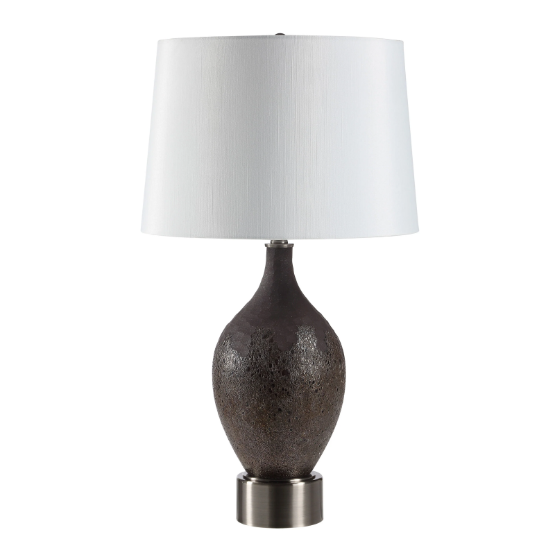 Add your designer's touch to any interior by including metal accents in your decorating scheme. This table lamp makes it easy thanks to its generously proportioned pewter-plated base that perfectly complements a glass body hand-painted in rich brown. Finishing off the look is an off-white faux silk shade for lighting perfection. Product Details: