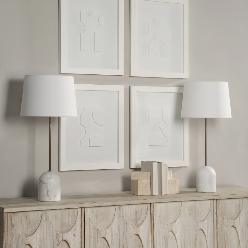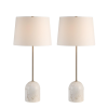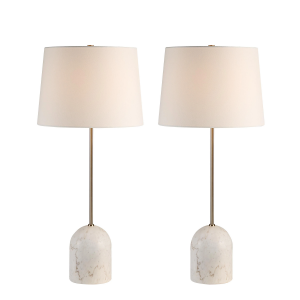 Put this marble and champagne-plated set of two stunning table lamps on your must-have list for rooms that crave symmetry and style. Ivory shades diffuse soft, dimmable light making this duo of lamps perfect for illuminating and elevating any interior. Feature them as part of an eye-catching vignette, or as simple yet stylish light sources in your next design project. Product Details: