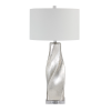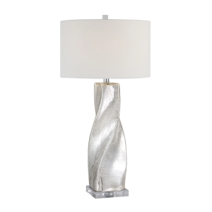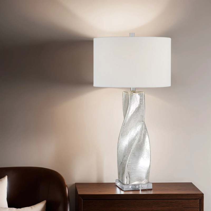 Looking to update your decorating project with a stylish twist? The Lyons table lamp is just the thing you need. Its sleek glass body features a stunning crackled mercury silver finish and crystal-clear base to catch light (and the eye!), making a memorable impact in any room. Topped off with a clean-lined off-white linen drum shade, this lamp is a perfect example of style and function. Product Details:
