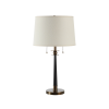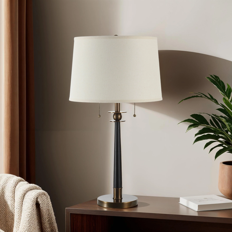 The Agrinio table lamp delivers a designer look that will easily complement any decor. Crafted with traditional appeal, it features a mix of finishes like matte black and antique brass-plated iron for a stunning effect as a living room lamp or bedroom lamp. Topped off with a beige linen tapered drum shade, a simple tug of this light's double pull chains is all it takes to illuminate any space in style. Product Details: