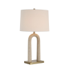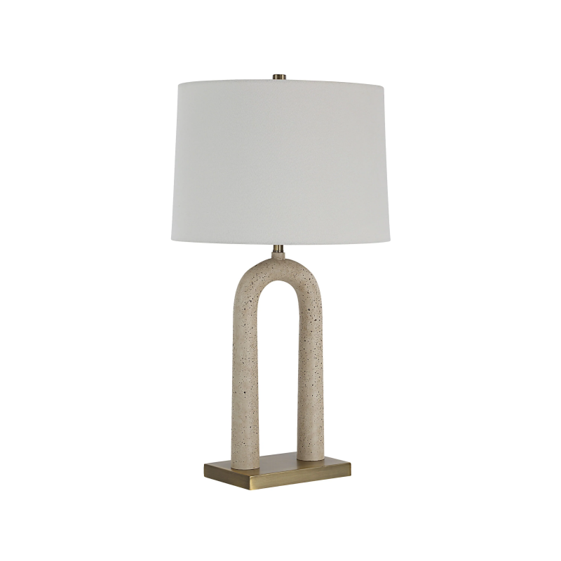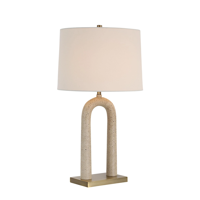 Inject a sculptural touch in any room with the Primula table lamp. Curvy lines come to life in its arched faux travertine body that sits upon an antique brass-plated base and topped off with a classic ivory linen drum shade. Just the piece to light up any home or office, picture one or a pair casting an ambient glow in a bedroom, living room, dining room or anywhere else in need of illumination and a stylish update. Product Details: