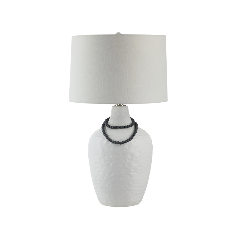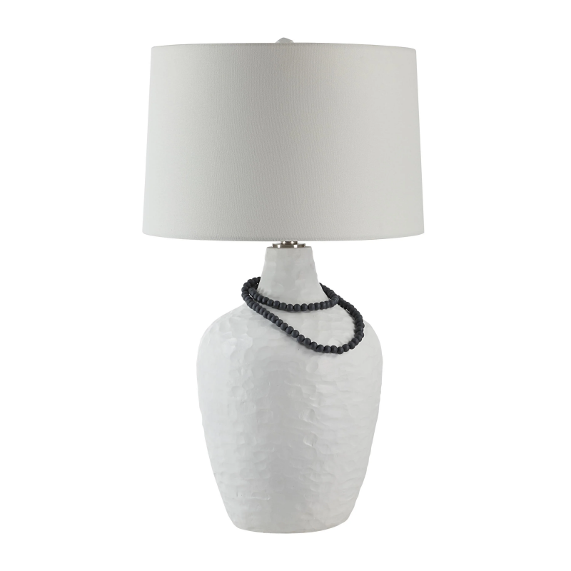 Anyone looking to add light and style to their home or office will want to get to know the Naranja table lamp. Crafted with a clean and simple silhouette, its white body is adorned with a whimsical necklace-inspired strand of beads that lends a casual fashion-forward vibe to any decorating scheme. Great for adding stylish illumination anywhere it sits, try one or a pair in any room for an instant update. Product Details:
