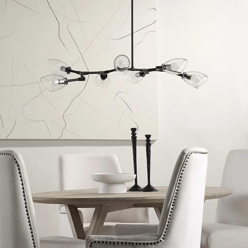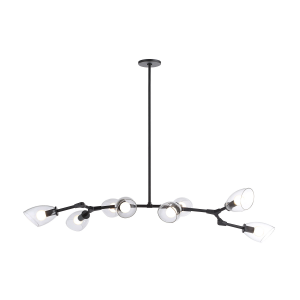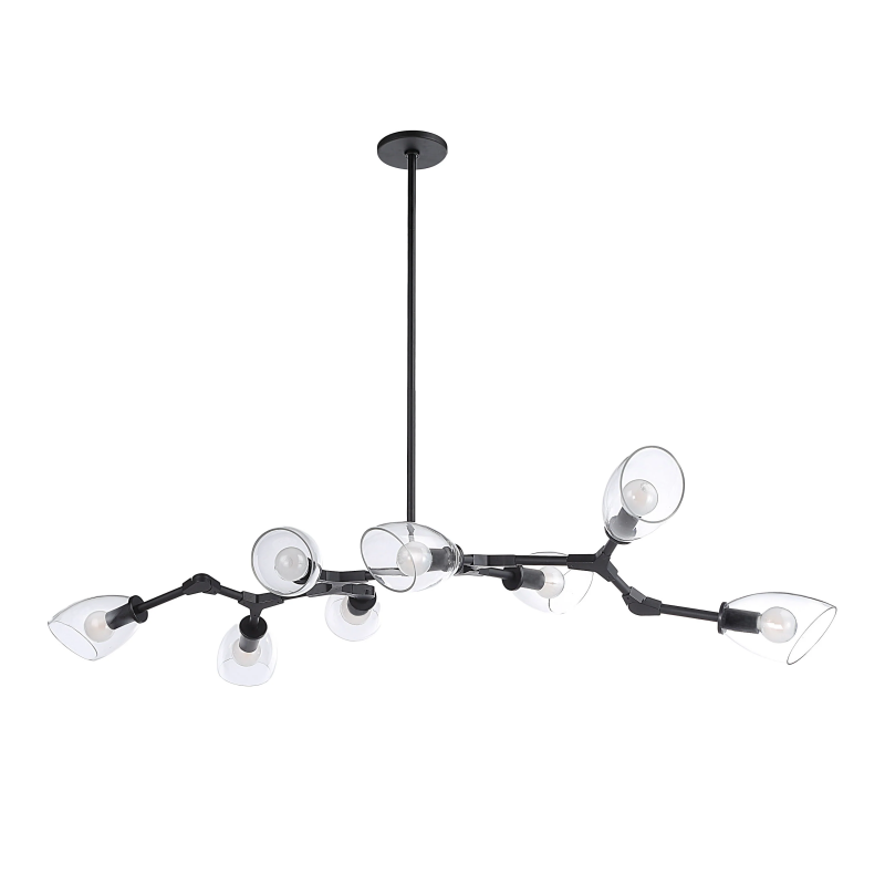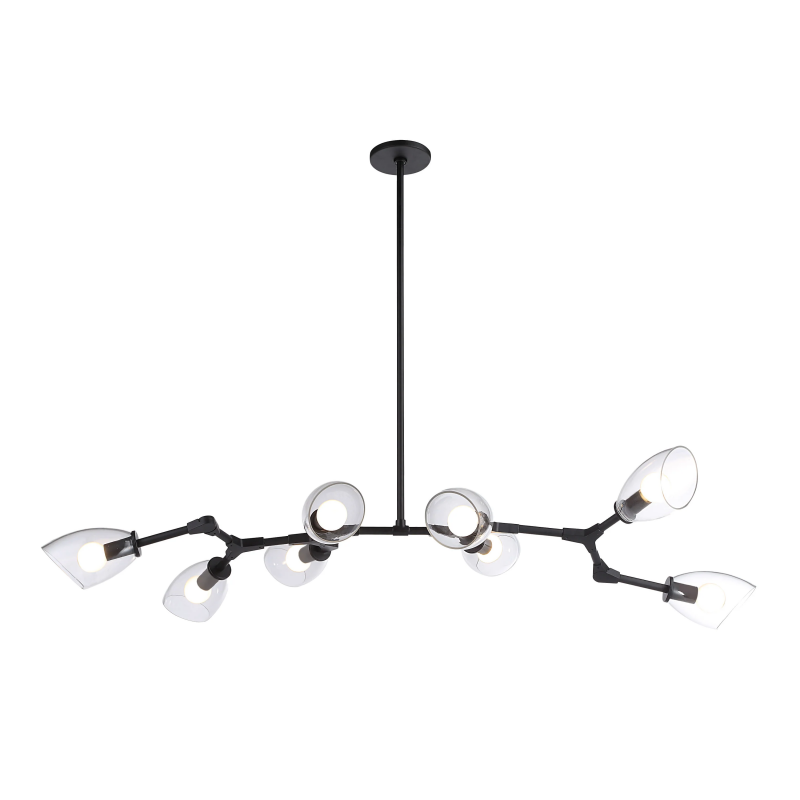 Sometimes a light fixture provides the finishing touch on a project and other times it is the kickoff point from which all other elements in a room gather inspiration. The Camino ceiling light fixture is a prime example of the latter. Its sleek iron body punctuates the space with a shot of matte black drama while 8 tapered glass shades cast warm ambient light to set the mood in any modern interior. Designed with a sprawling construction, it has a generous span of 54" making it the ideal fixture for placement over a dining or kitchen table or anywhere else in need of a bold lighting statement. Product Details: