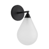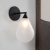 Light up your life with Lola, the stylish and modern wall sconce. Featuring a teardrop shaped etched glass shade suspended from a matte black powder coated mount, it sheds ambient light wherever it hangs. With no unsightly wires to get in the way of its great looks, this fixture is hardwired and comes with the exact bulb it needs. A duo of these wall light scones would look great whether flanking a mirror in an entryway or hanging bedside over a pair of nightstands. Or try one on its own to cast light on a reading nook; wherever Lola winds up, the result will be memorable. Product Details:
