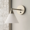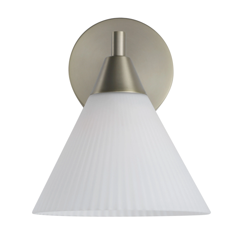 Combining the best of classic and modern design, the Bocca 1-light sconce delivers something special to any room. Crafted using high-quality materials, it features an on-trend yet timeless champagne plated finish for a dash of warmth and luxury. A cone-shaped fluted glass shade diffuses ambient light in any space it graces. Perfect for flanking a bed, lighting up a reading corner, shedding a warm glow in a dining room or anywhere else that could use a little illumination and charm, this light wall sconce is hardwired so no unsightly cords get in the way of its great looks. Light up your life the minute it’s installed thanks to an included bulb and dimmer switch that lets you to customize the light level to suit your needs and mood. Product Details:
