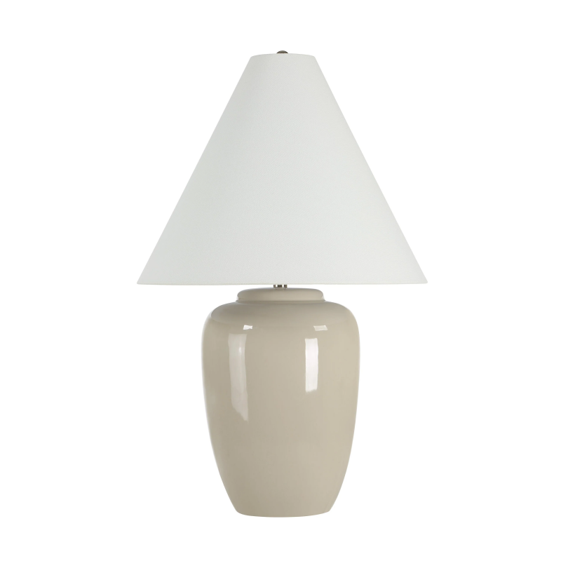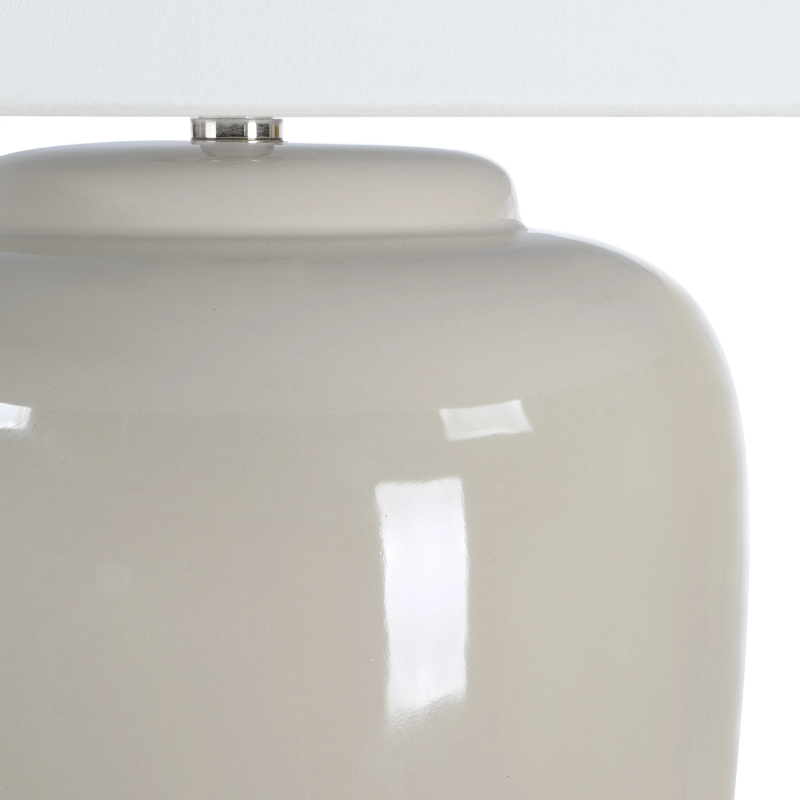 The Anne table lamp combines modern refinement with timeless style. Its smooth taupe ceramic base and polished nickel accents pair with an off-white linen shade that casts a soft, inviting glow. With a dimmable switch for personalized ambiance, it brings warmth, balance, and understated elegance to any room or neutral decorating scheme. Product Details: