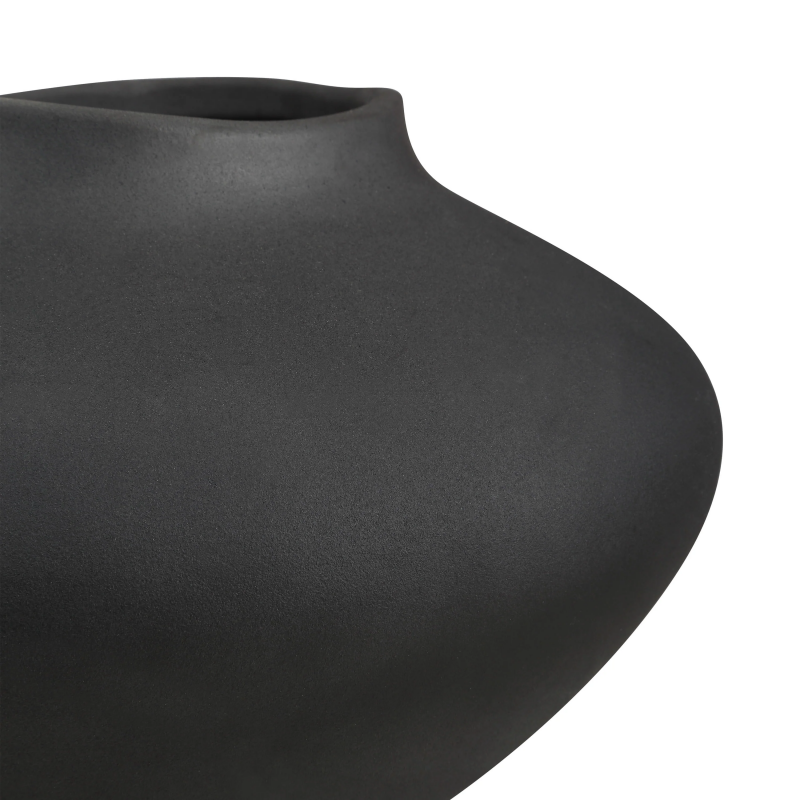 Sure to be an attention grabber, this decorative ceramic vase is perfectly proportioned for displaying as a focal point in any modern interior. Crafted with an organic shape for a hand-thrown look, it holds a casual presence anywhere it sits. Teamed up with other objects or all on its own, this textured matte black vase will quickly become your go-to accessory. Product Details: