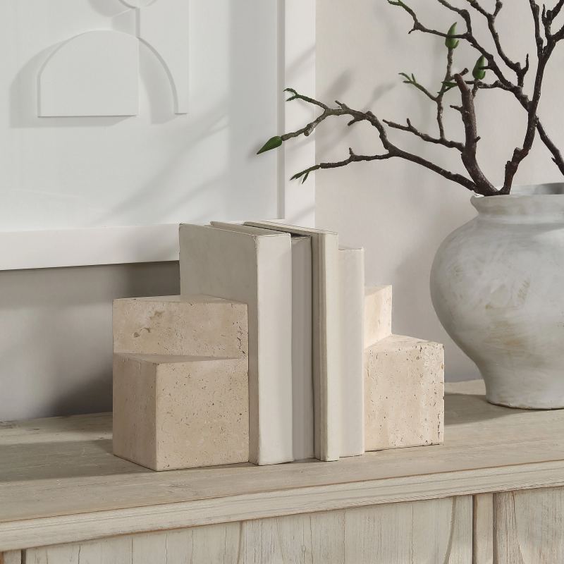 Thanks to its natural appeal and enduring charm, travertine is seeing renewed popularity in the world of interiors. A great fit in contemporary and transitional settings, this set of two travertine bookends will inject warmth, texture and visual interest to any bookshelf or table.