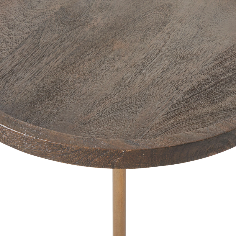 Measuring 18 inches wide, this accent table is an ideal size for placement next to a couch, chaise longue or bed. It features a natural marble and antique brass finished iron base for an airy feel and a mango wood tabletop with a walnut finish for a dark wood effect that’s totally on trend. Sleek and simple in its design, this end table would be a great complement to any design project. Product Details: