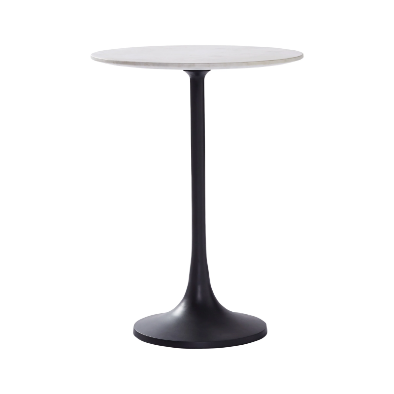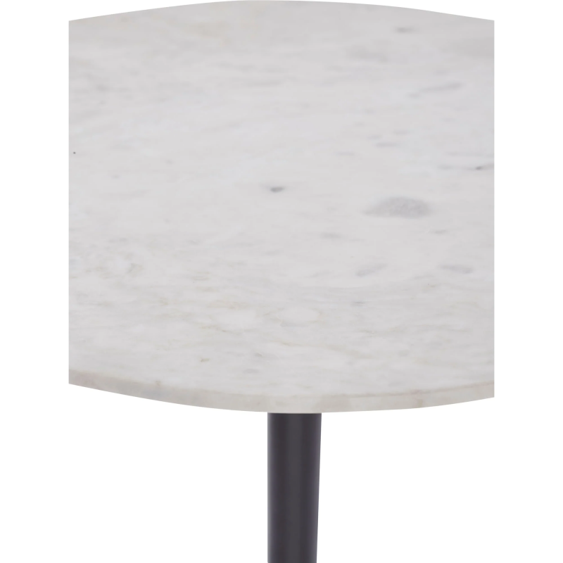 The effortlessly chic quality of a contemporary cafe is transported to the home through this table design. Styled amid minimalist, modern pieces, its innate grace has a chance to shine. As the black powder-coated iron base makes a bold impact, the natural marble surface brings a European elegant appeal. Product Details: