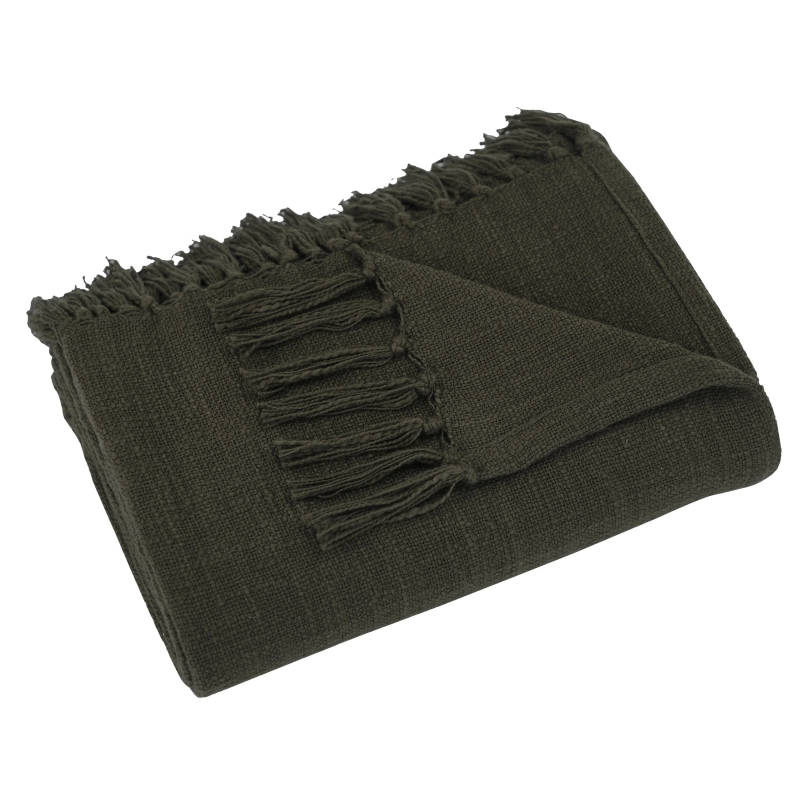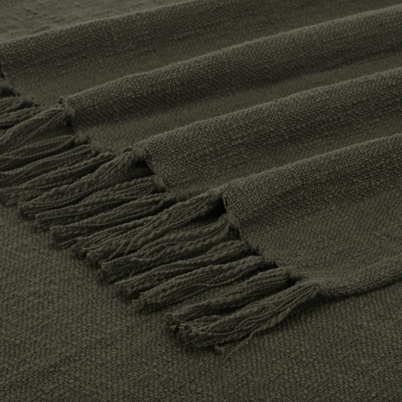 When it comes to bed throws or sofa throws, one should never sacrifice comfort for style. The Chalamet throw proves you can have both. Woven from 100% cotton, this olive-hued blanket features a luxurious texture and eye-catching fringed trim for visual interest. Even when it’s not in use, this accessory adds beauty and dimension to any space. Throw it casually over a sofa or lay it at the foot of a bed to create a stylish layered look. Once you discover the relaxed vibe and cozy feel of this blanket, you may want to pick one up for every room. Product Details: