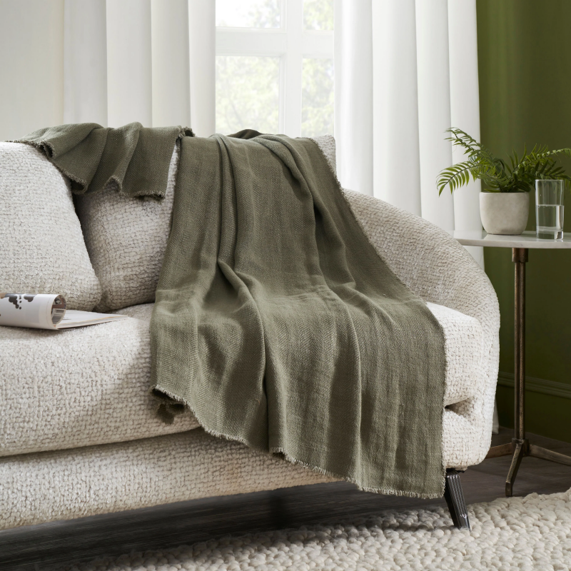 Indulge in luxurious comfort and elevate your home decor with Vernier Linen Throw in dark green. Made with 100% yarn dyed linen and weighing 450gsm, this throw provides ultimate plushness that feels like a warm embrace on a chilly night. The clean woven herringbone design adds a touch of elegance to any room, making it a stylish decorative accent for your living space. The distinctive frayed edges of the throw add a unique, on-trend detail that makes it stand out from the crowd. Whether you're snuggling on the couch, adding warmth to your bed, or looking for a statement piece to enhance your decor, this linen throw has got you covered. Its generous size of 70" W x 50" H ensures that you'll be wrapped in a luxurious and cozy embrace whenever you need it. Product Details: