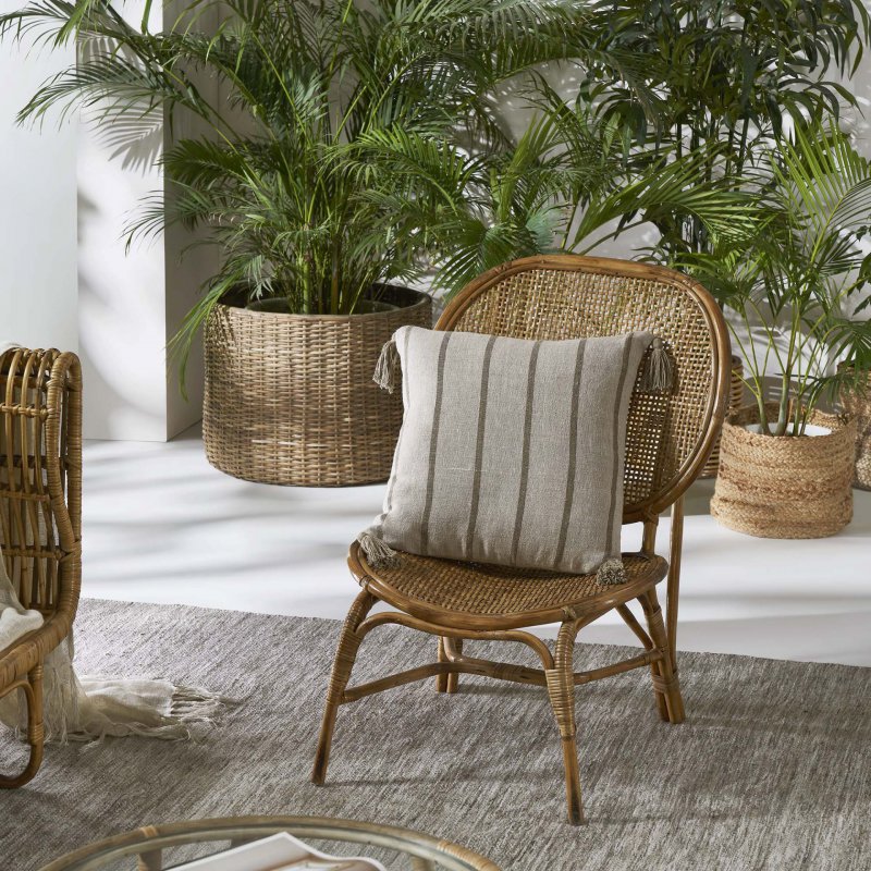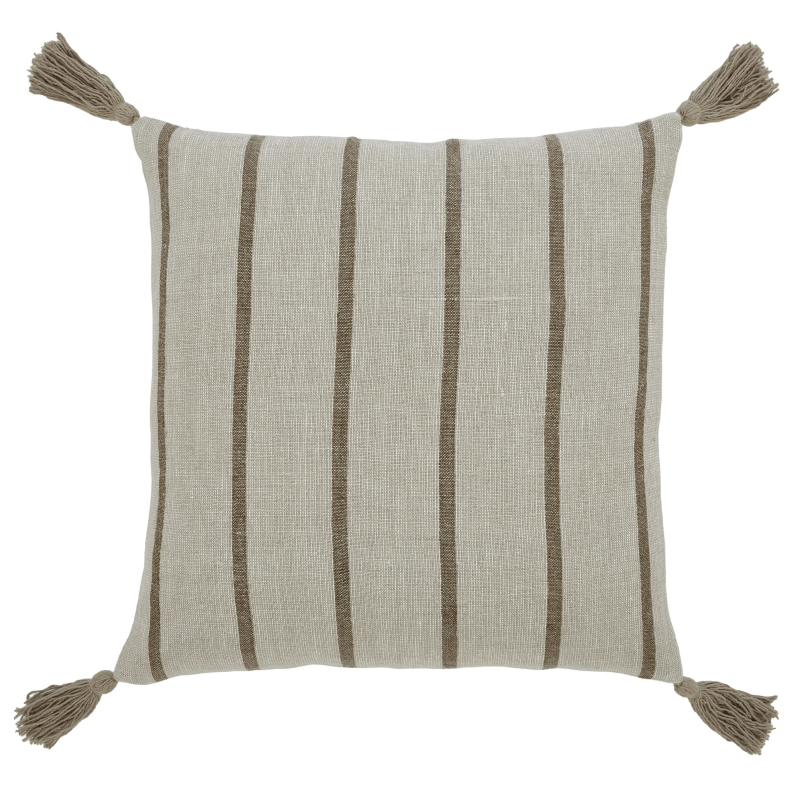 Tassels and stripes take this natural brown throw pillow design to the next level and infuse any interior it enters with charm. Thanks to its versatile square size, this decorative pillow can be placed alone on a seat or bed or arranged with other pillows of differing sizes. This pillow's 100% linen structure and down/feather filling makes it not only comfortable to rest upon but allows it to maintain its shape over time. Product Details: