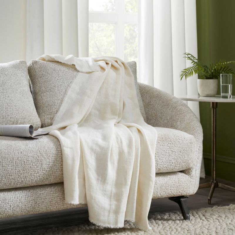 The Ragusa Linen Throw is the perfect blend of style and comfort. Made with 100% yarn dyed linen, this throw provides ultimate plushness and warmth. The clean woven herringbone design adds a touch of elegance to any room, while the distinctive frayed edges add a unique, on-trend detail. With overall product dimensions of 70" W x 50" H, this throw is perfect for snuggling on the couch, adding warmth to beds, or as a stylish decorative accent. Product Details: