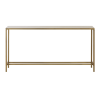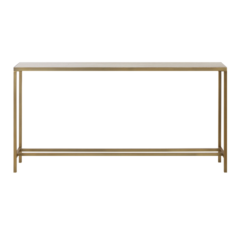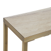 Made of travertine and antique brushed brass-plated iron, this luxurious accent console table will elevate any home or office. Display it in an entryway to wow guests upon arrival, try it as a sofa table to hold an eye-catching vignette or in a dining room as a stylish bar. Tap into your creativity for endless uses. Product Details: