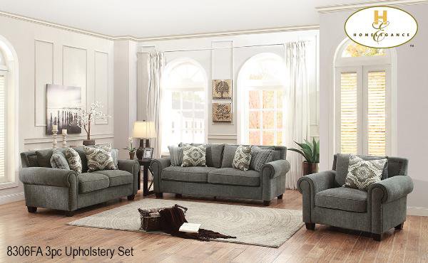 | Recessed nail head trim defines the shape of this elegant seating offering. The trend-forward grey body cover is accented with both stripe, and medallion pattern toss pillows. Feather down blend reversible seats and backs provide a plush platform for you to relax. |