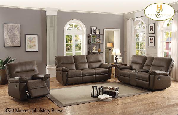 | The Nell Collection. Brown leather gel match provides textural comfort, while ample padding of the arms, seats and backs creates a plush environment for your relaxation. Glider reclining mechanism are featured on the loveseat with center console and chair, while the dual reclining ends of the sofa flank the drop-down back of the center seat-opening to reveal a tabletop platform with cup holders. |