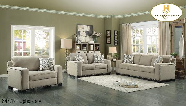| The Gowan Collection. Eight-way hand-tied seat construction provides support for the feather and polyester blend seating. Offered in beige and brown chenille, the neutral tone bodies are complemented by the contrasting geometric floral pattern toss pillows and nail head accented ottoman. |