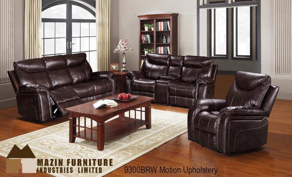 | Traditional Motion Upholstery Collection covered in Brown Gel Leather-match. Also available in Grey or Red Gel Leather-match. |