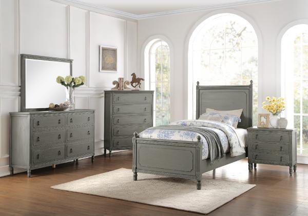 | The Aviana Collection. An antiqued grey finish provides an open canvas for your personal decorative touch. Carved feet support classically styled case goods - each featuring teardrop hardware with an antiqued pewter finish. The collection is offered in twin, full, queen and king for perfect placement in your home. |