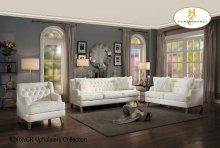 Upholstery Collection accented by tufted back and accent pillows on the loveseat and sofa. Offered in Cream or Grey Airehyde.