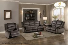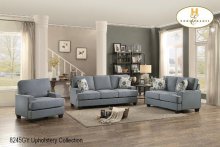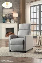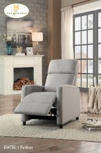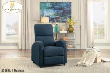 The Manasa Collection. A modern profile with convenient functionality creates a platform for relaxation. The blue fabric covered push-back reclining chair eases into the prone position with motion that is initiated by your push.