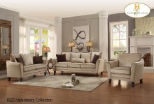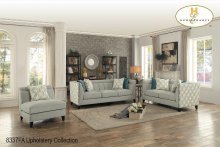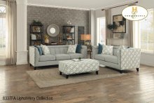 The Temptation Collection. Light grey fabric features subtle texture with bold accenting outer body cloth providing visual interest. The steel blue quatrefoil pattern adorns the arm's end panels, ottoman and toss pillows. Oversize nail head accent follows the form of the seating group defining the profile of each piece in the collection.