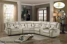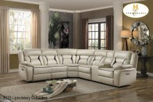The Amite Collection. Beige leather gel match is perfectly complemented by dark brown accenting on the seatbacks, seats and arms, providing contrast and definition of the profile of the collection. With the push of the power reclining mechanism, the end and armless chairs recline to the prone position. The console unit features hidden storage as well as cup holders for convenient functional use. The corner center unit and stationary armless chair do not recline.