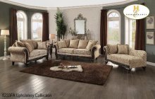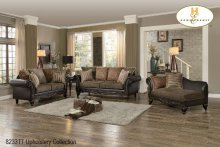 The Thibodaux Collection. Offered in two coverings - Brown fabric with bi-cast vinyl accent or neutral toned acanthus print fabric - the collection combines these covers with a dramatic show wood frame that features carvings and scrolled arms. Contrast toss pillows complete the look.